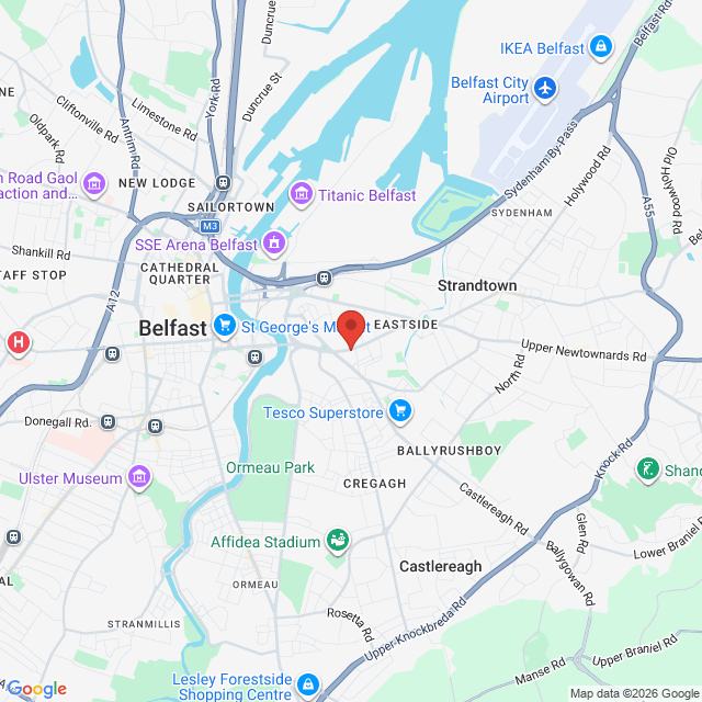 Suite 1, 179 Albertbridge Road. Just behind the glider bus stop, you will see a set of brown doors.